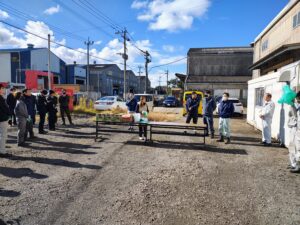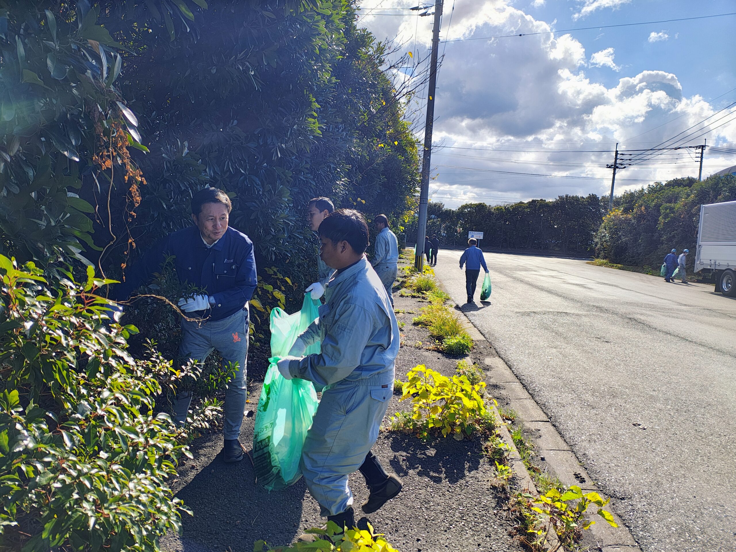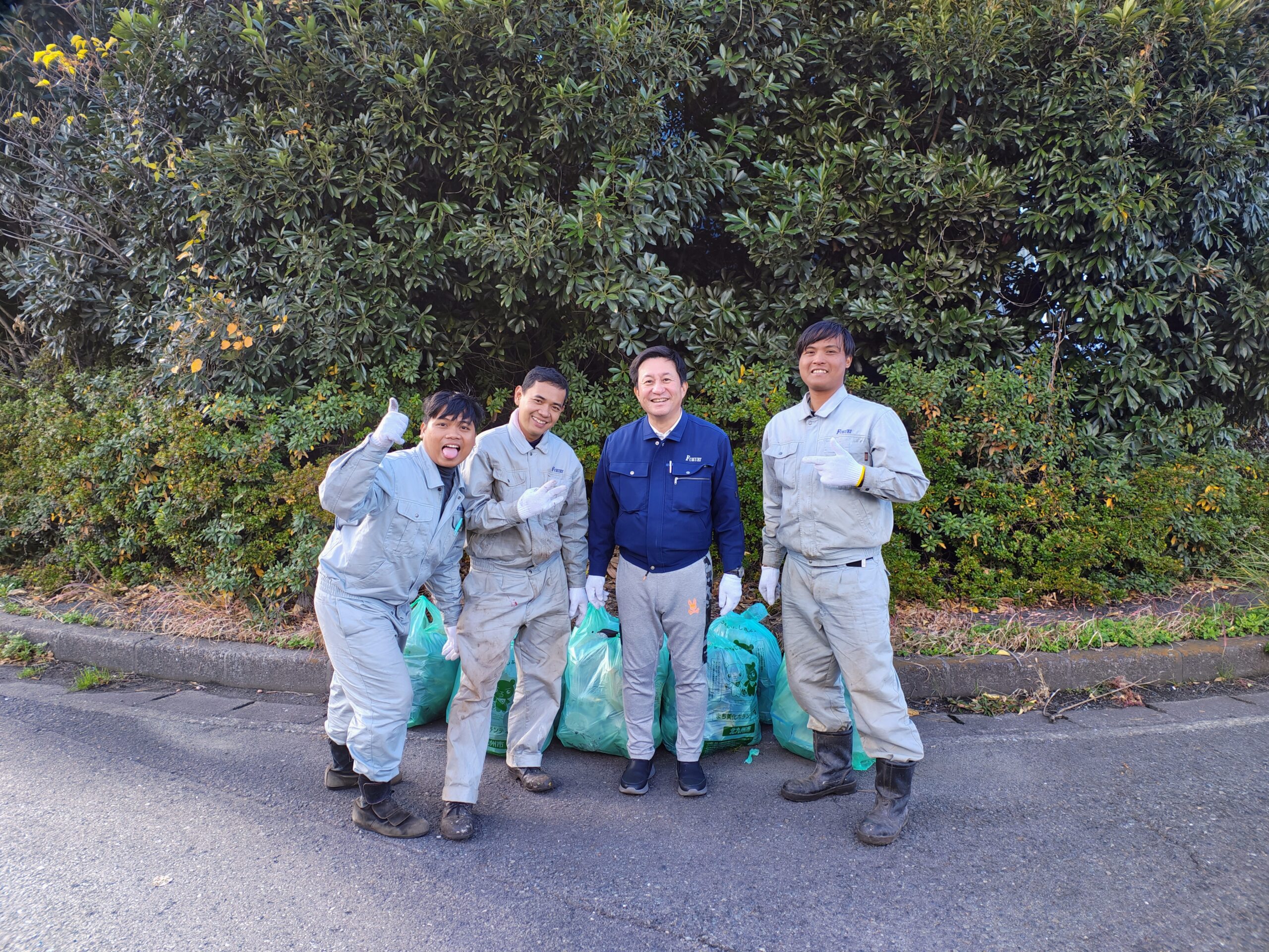 弊社社長は、響灘工業団地自治会の会長を務めており、当日は社長をはじめ、喜田さん、先日のボウリング大会で活躍したロニさん・スロトさん、そして12月入社のダンバンさんと一緒に、工業団地内のゴミ拾いを行いました。